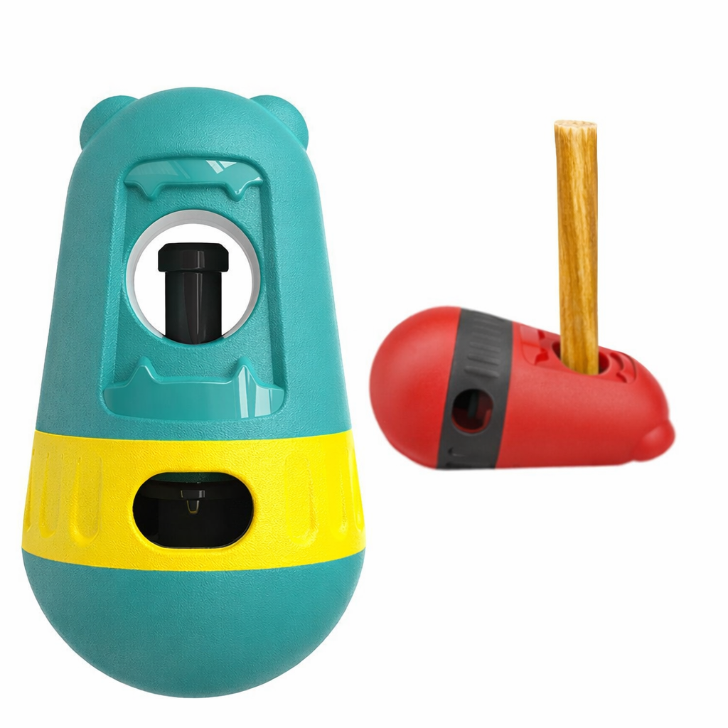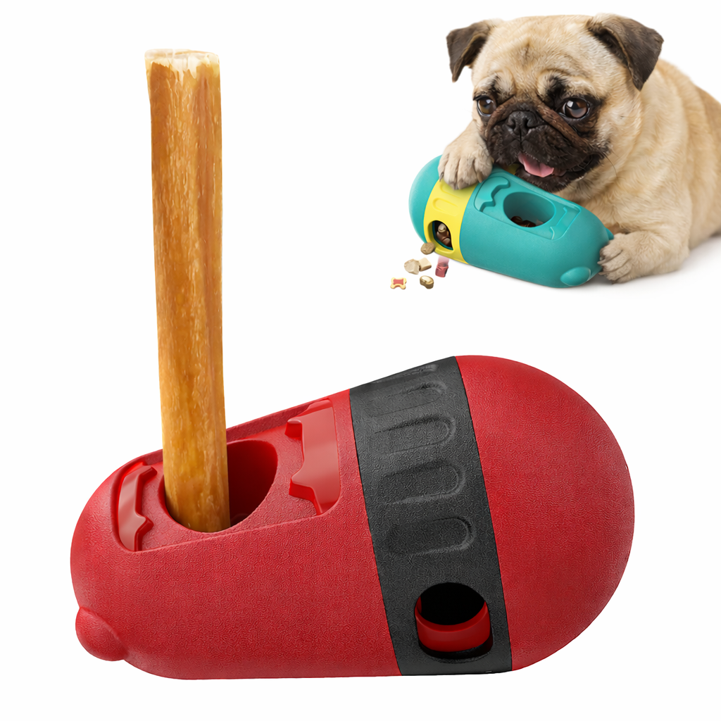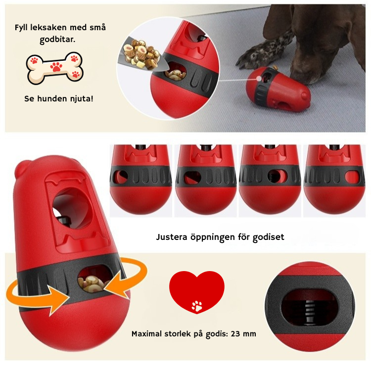🔸 Aktiveringsleksak – fyll den med små godbitar. När hunden puttar, rullar eller nosar på leksaken trillar belöningen ut bit för bit. Perfekt för långsammare ätande och mental stimulans.